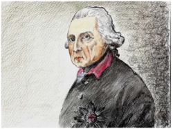 Friedrich II., Sohn von Friedrich Wilhelm I. (auch bekannt als „Soldatenkönig“) und Sophie Dorothea von Hannover, war von 1740 bis 1786 König von Preußen. Durch die äußerst strenge und militärische Erziehung Friedrichs durch seinen Vater entstanden später viele Konflikte zwischen Vater und Sohn, der eher an Kunst und Musik als am Kriegshandwerk interessiert war.
