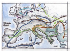 Dès le 3 siècle av. J.-C., plusieurs grandes invasions sont déclenchées par les changements climatiques, le manque de terre et la pression croissante exercée par d'autres peuples. Dans le contexte de l'Histoire européenne et occidentale, ce sont les grandes invasions germaniques qui revêtent une importance particulière. À leur origine : les Huns, un peuple de cavaliers d'Asie centrale, qui avance à l'Ouest vers 375 apr. J.-C. tombant ainsi sur les peuples germaniques qui s'y sont établis. Ceux- ci, obligés de céder à la pression exercée par les Huns, se transforment en une véritable menace pour l'Empire romain. Nombre de ces peuples germaniques traversent ensuite la frontière du Rhin et s'installent, en tant qu'alliés, sur le territoire romain, si bien que l'Empire romain occidental finit par céder à la pression migratoire des peuples germaniques. La reconnaissance de l'officier germanique Odoacre comme roi d'Italie par l'Empire romain d'Orient scelle la fin politique de l'Empire romain occidental en 476 apr. J.-C. Par la suite, ce sont surtout les Francs qui dessinent la forme de l'Europe moderne. D'un point de vue culturel, les Romains ont plusieurs années d'avance sur les peuples germaniques : ils se sont donné un ordre politique stable réglant la vie sociale. Ainsi, les Francs tirent grand profit de leur rencontre culturelle avec les Romains. En plus du christianisme, déjà bien répandu dans l'Empire romain, ils reprennent aussi les acquis culturels et l'ordre politique des Romains. La philosophie de l'Antiquité et l'art romain font partie intégrante de notre culture occidentale moderne. On peut dire que les grandes invasions germaniques marquent le début de la transition de l'Antiquité au Moyen Âge.