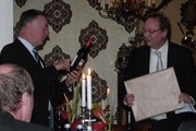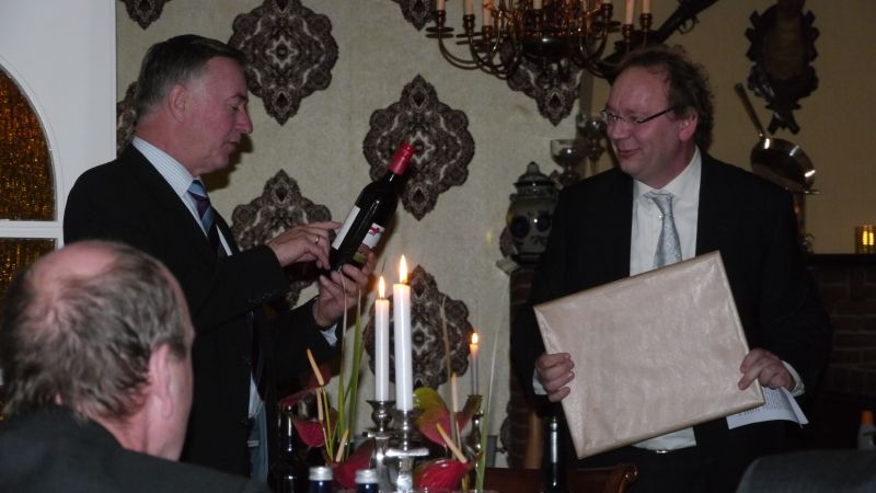 von rechts: Der Rektor der RSG Ter Apel Jan de Wit überreicht dem Festredner Alexander Sakkers einen guten Tropfen.